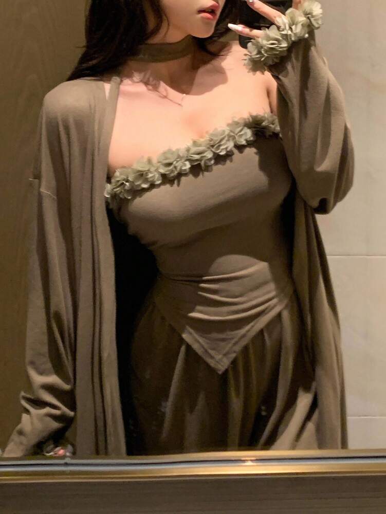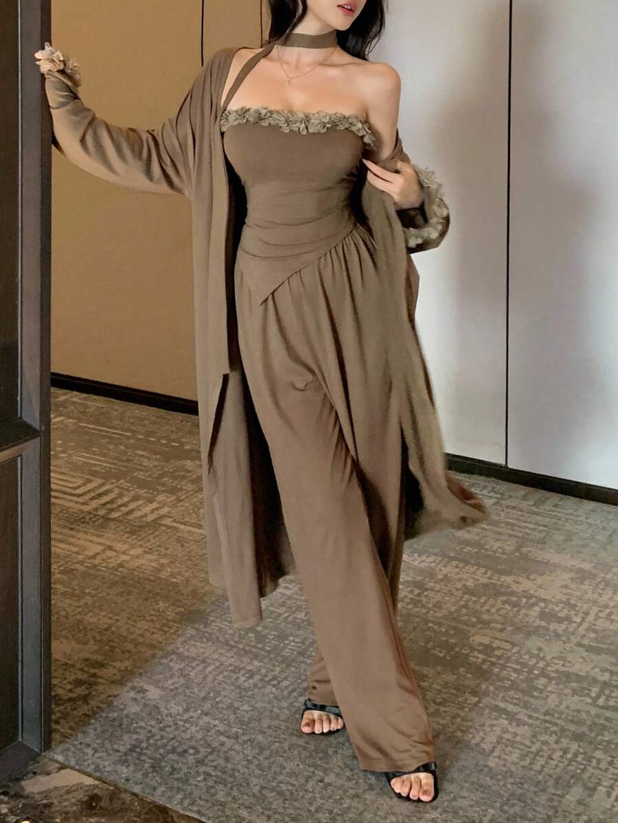 This women's 3-piece home outfit offers a refined blend of comfort and style, perfect for fall and spring/summer seasons. The set includes a loose cardigan jacket with long drop shoulders, a slim-fit bustier top featuring a delicate spaghetti strap neckline and asymmetrical hem, and wide-leg knitted fabric pants with slight stretch for ease of movement. Crafted from a polyester-elastane blend, this midi-length ensemble is breathable and durable, ideal for daily home or casual wear. Easy to care for with machine wash or professional dry cleaning, it suits teens and bridesmaids seeking a relaxed yet elegant loungewear option.